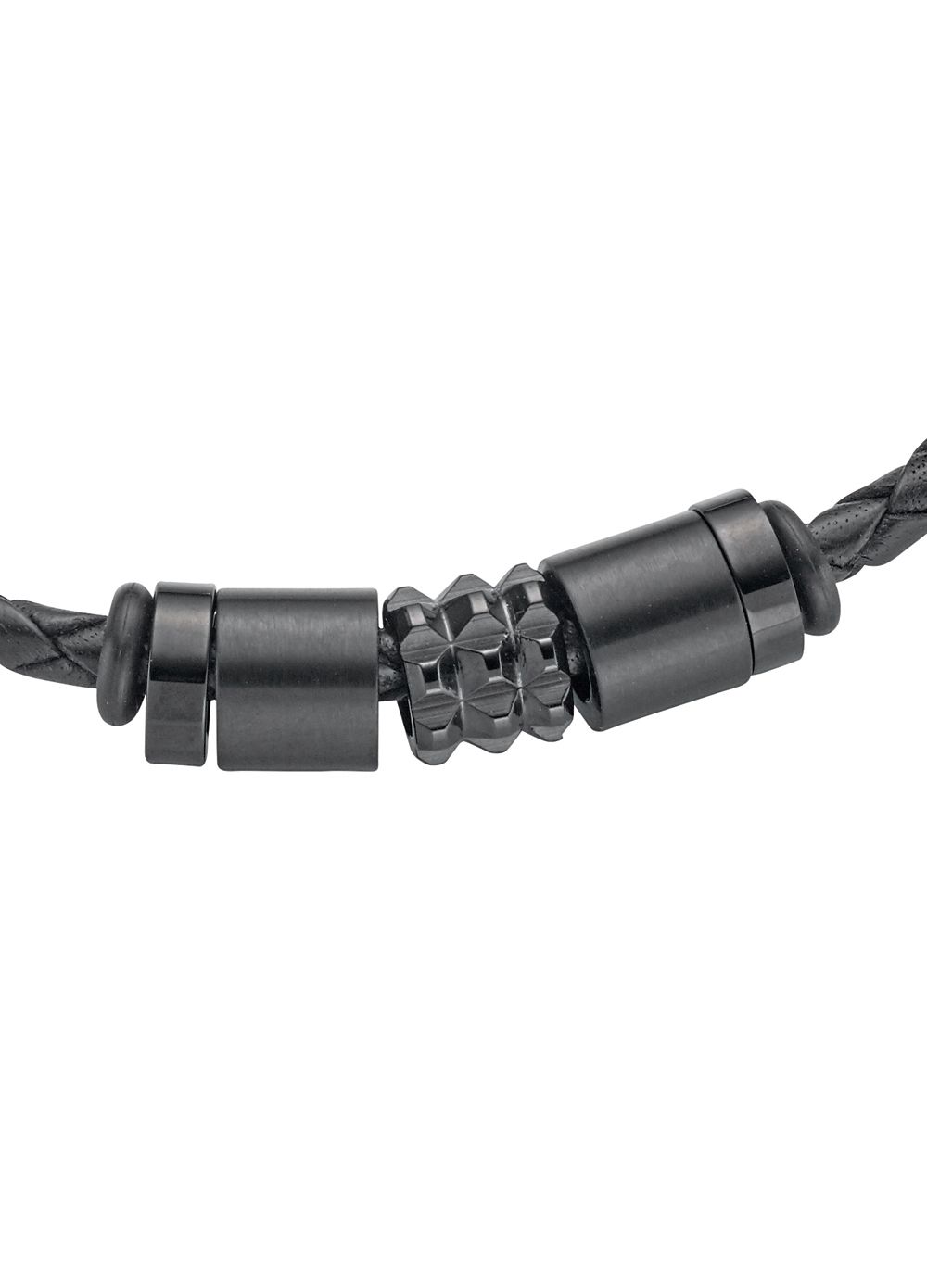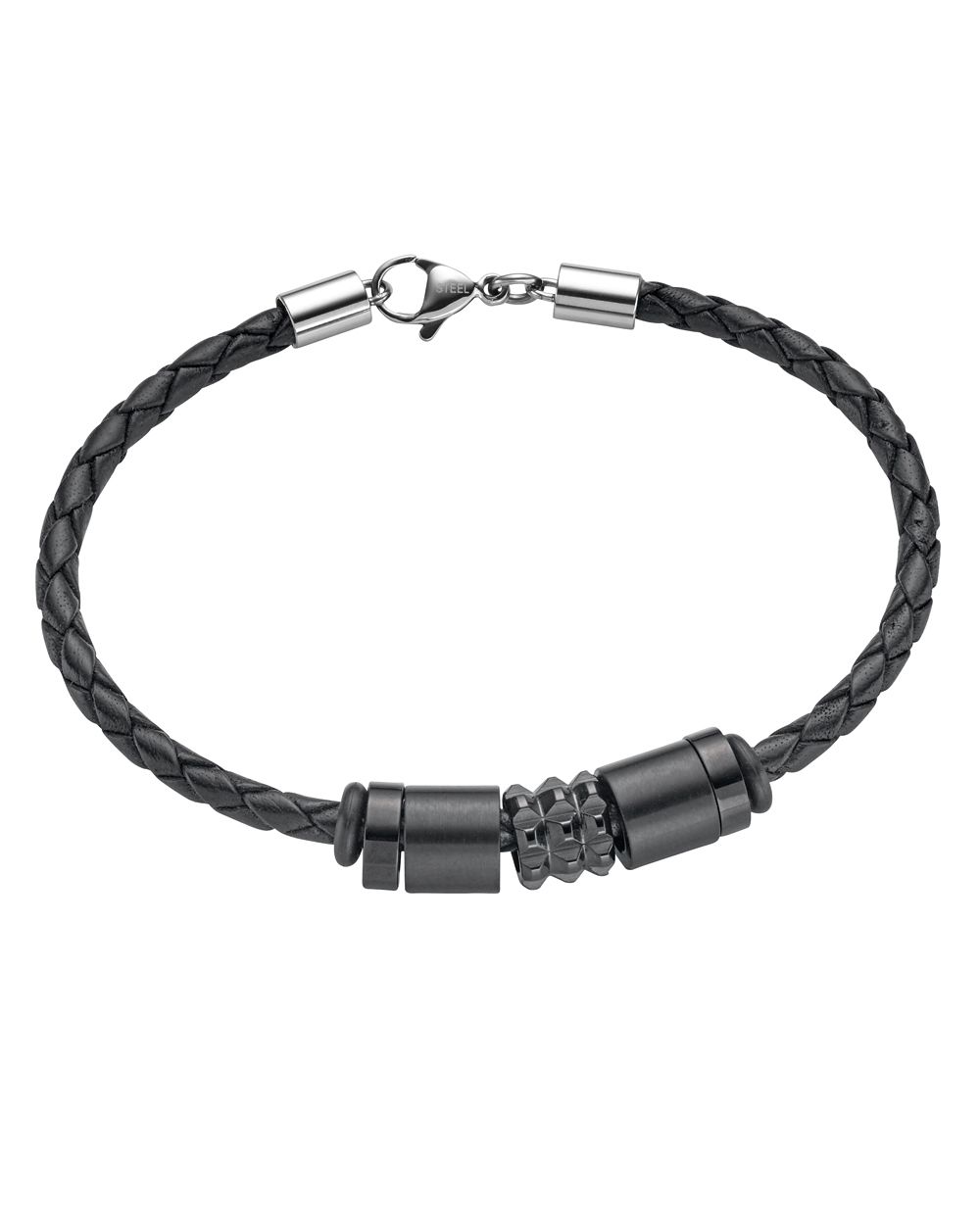 Sonstiges: Armband aus geflochtenem, schwarzen Leder. Mittelteil (Anhänger) mit Edelstahlelementen