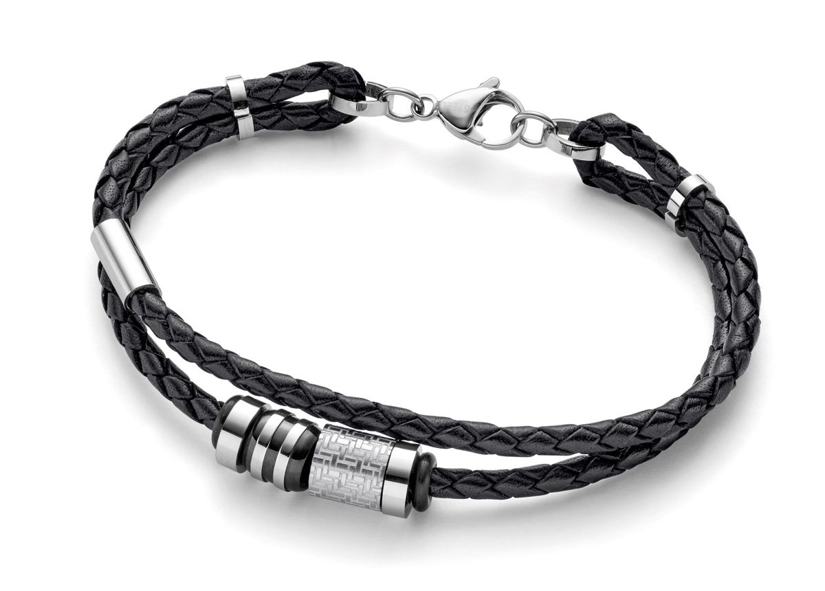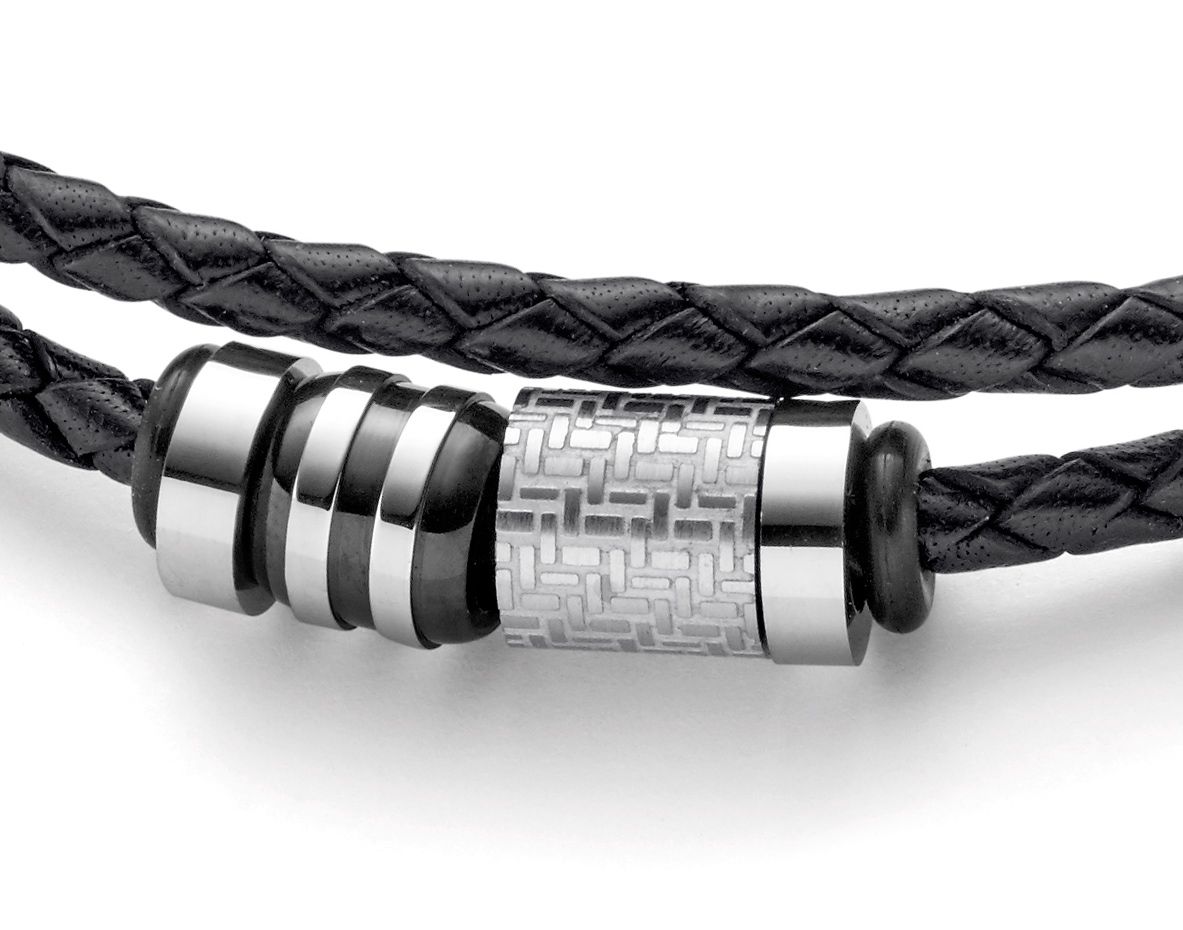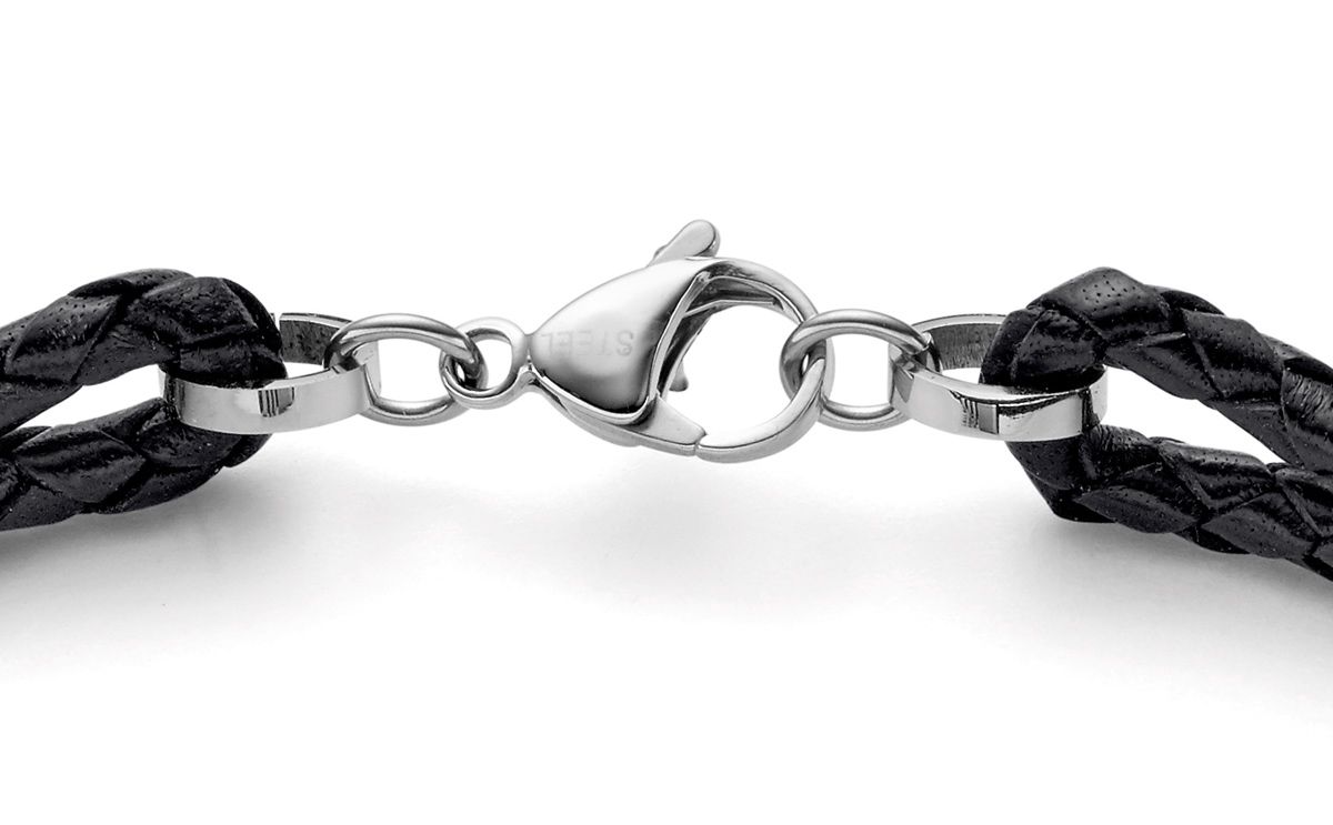 | Sonstiges: | Armband aus geflochtenem, schwarzen Leder. Mittelteil (Anhänger) mit Edelstahlelementen |